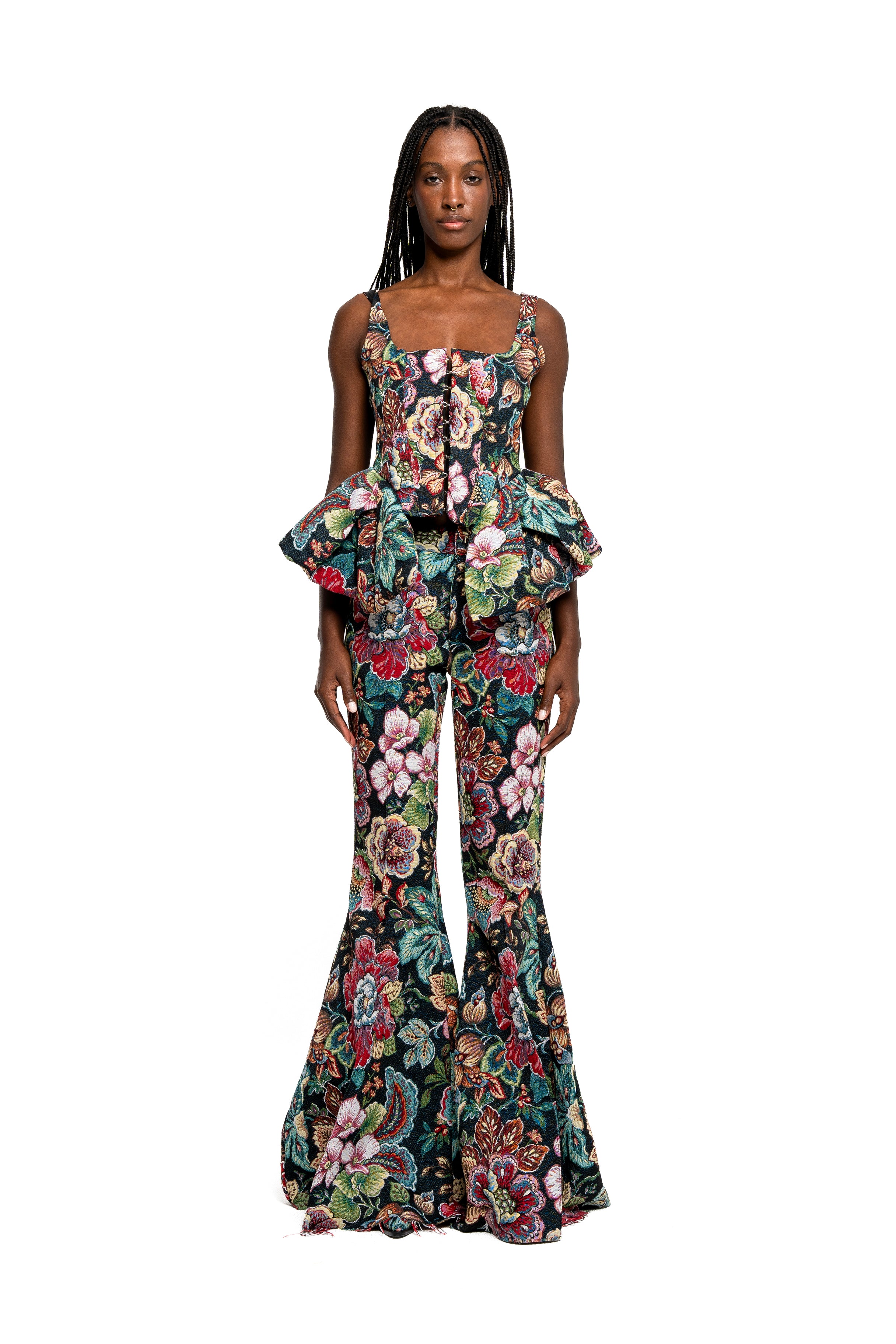 BLACK BROCADE EXTREME FLARE TROUSERS