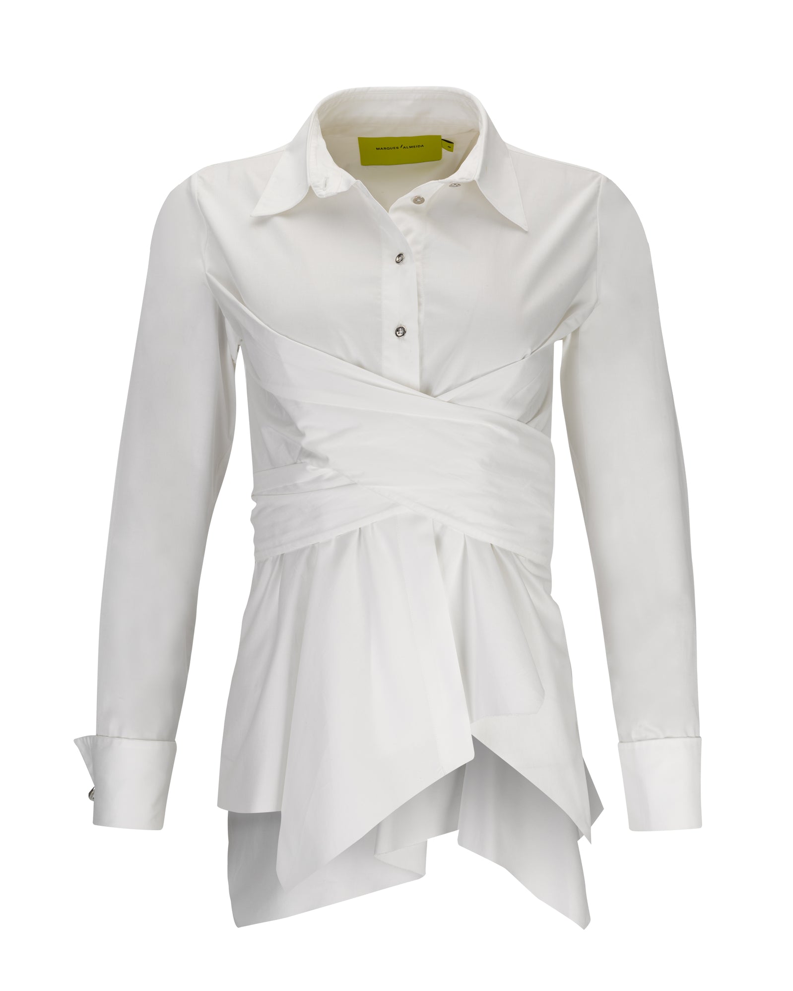 Elevate your style and feel confident in this white cotton shirt. Its front cross wrap design adds a unique touch to any outfit, while the long sleeves provide coverage and comfort. With convenient front buttons, this shirt is both fashionable and functional for any occasion.